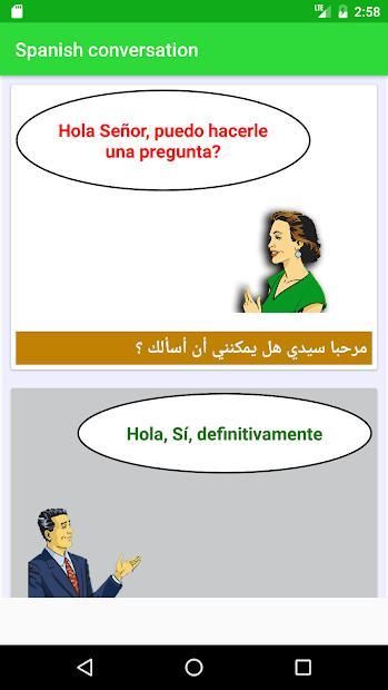 Dalam aplikasi ini, yang menjelaskan bahasa Spanyol dengan cara percakapan antara dua orang membuat penerima memahami kosakata bahasa Spanyol, sehingga itu terdiri dari pembicaraan di kereta api dan bandara, di stasiun kereta api, bus, ketika dokter dan juga percakapan percakapan dalam bahasa Spanyol.