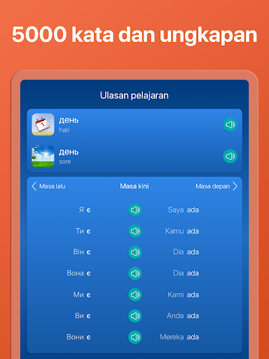Belajar bahasa Ukraina dengan materi gratis tiap harinya. Dengan Mondly, belajar bahasa Ukraina jadi cepat dan efektif. Dalam hitungan menit, Kamu bisa hafal kosa kata utama bahasa Ukraina, mampu membentuk kalimat-kalimat, menguasai frase-frase bahasa Ukraina, dan mampu terlibat aktif dalam percakapan. Teknik belajar bahasa Ukraina yang menarik ini dapat meningkatkan daya serap kosa kata, tata bahasa dan pengucapan secara jauh lebih cepat jika dibanding metode belajar bahasa lainnya. Pemula atau senior, hobi travelling atau sibuk ngurusin bisnis dengan jadwal super ketat? Aplikasi ini bakal nyesuain kebutuhan kamu dengan dinamis.