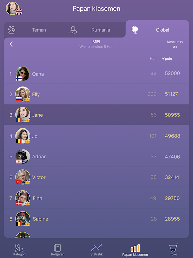 - Statistik lanjutan. Program ini memakai pelaporan pintar, jadi hasil belajar kamu selalu terupdate. Bangun kosa kata kamu dan jadilah lebih baik setiap harinya.