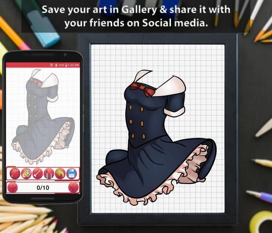 If you want to draw beautiful princess dresses but have no idea how to do it, don't worry. Just install our Learn How To Draw beautiful dresses app & follow the step by step guide. Draw directly on your phone's screen or draw beautiful dress on a paper. It's a free Tutorial for Drawing cute princess dresses. Bring the creativity to the next level. Draw adorable princess dresses and save it inside your phone. You can share the drawing of these beautiful dresses on social media with your friends.