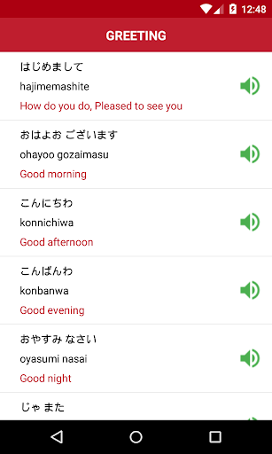 "Learn Japanese Full Audio" include over 1000+ phrases with 50 categories(Greetings,Food,Adj,Verb,Number,Day...) serve the purpose at tourists and business people visiting Japan