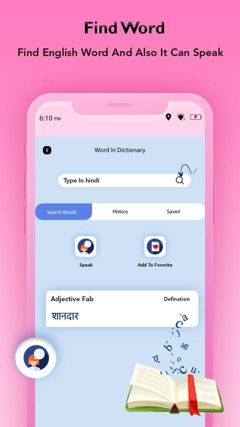 terbesar dengan lebih dari ribuan kata Hindi dan Inggris dengan artinya. Arti kata-kata bahasa Inggris disediakan dengan definisi dalam bahasa Hindi, sinonim dan antonim seperti yang diberikan. Dengan makna yang diberikan pengguna dapat memahami penggunaannya dan contoh kalimat untuk menentukan kalimat yang tepat dan terjemahannya. Pengguna juga dapat mendengarkan pengucapan kata-kata untuk membaca dan berbicara dengan benar melalui fitur bicara yang diberikan dalam aplikasi. Latihan percakapan dan berbicara untuk percakapan sehari-hari dengan berbicara benar-benar akan meningkatkan keterampilan