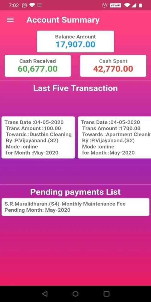 legend Anantara apartment maintenance view application is an application to view all the details like amount collected, amount spent, balance amount, pending payments, last five transaction, users, apartment details, flat details, helpline numbers for easy call and shopping.