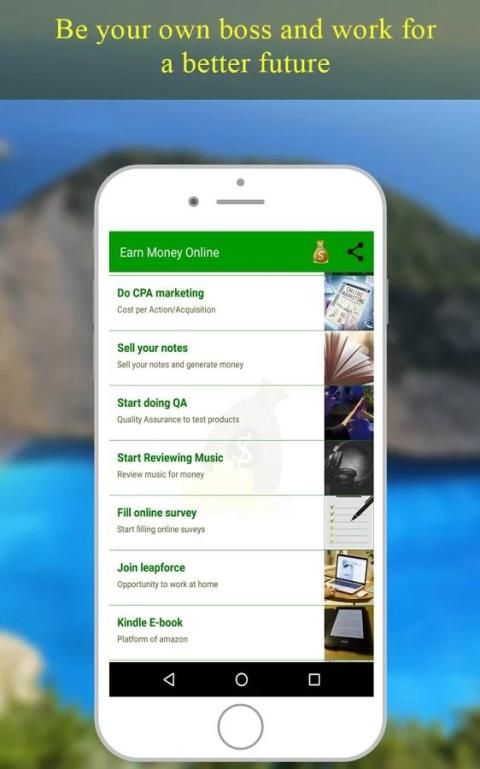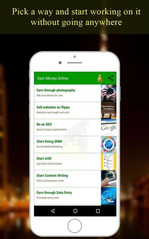 Anda hanya harus memilih cara yang menarik Anda yang paling dan mulai bekerja pada itu, aplikasi ini tidak menargetkan kelompok orang tertentu, Anda dapat menemukan cara-cara tidak peduli Anda seorang mahasiswa mencari tentang cara untuk mendapatkan uang secara online atau seseorang yang lelah pekerjaannya mencari ide wirausaha.