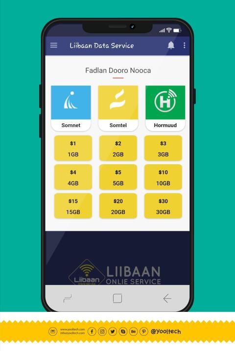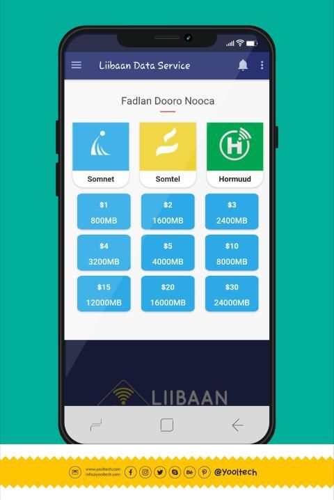 Waxaad ka iibsan kartaan xirmooyinka SomNet. Hada kadib uma baahnid in aad cid la hadashid ama qarash telefan ku bixisid si laguugu shubo xirmo SomNet hadii aad isticmaashaan Libaan Data Services app. Sidoo kale ka waxaad ka heli doontaa Adeegyada EVC Plus, ANFAC iyo Artimet