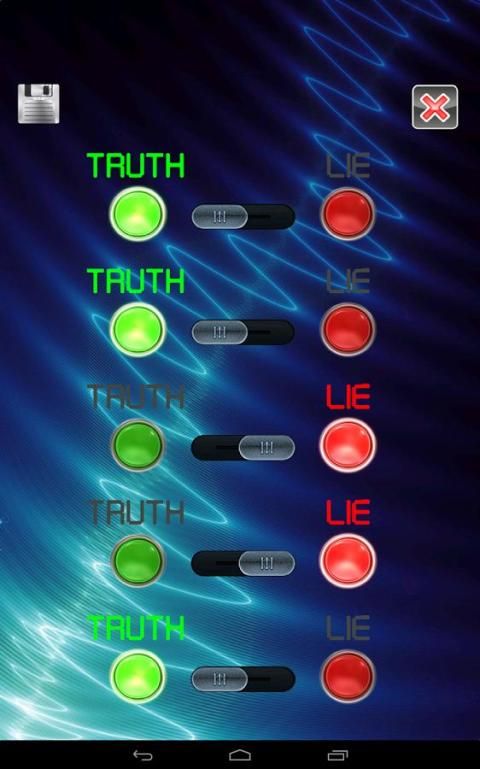 Detektor kebohongan mensimulasikan scanner suara untuk mendeteksi kebohongan. Mengolok-olok teman Anda, anak-anak atau orang lain dengan membuat mereka berpikir Anda dapat mendeteksi jika mereka berbohong kepada Anda.