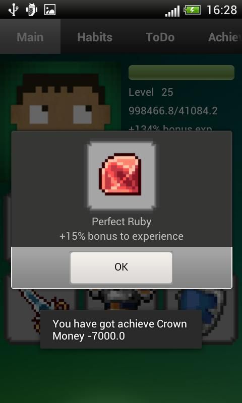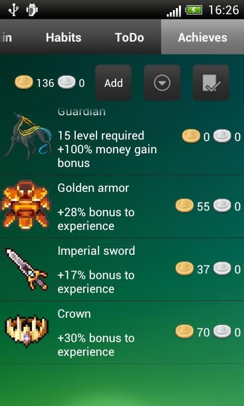 Layar "Prestasi". Memperoleh beberapa koin dan tidak tahu apa yang harus dilakukan dengan mereka? Tambahkan ke daftar ini hal-hal baru / perbuatan yang Anda sukai dan menetapkan harga untuk mereka. Penghargaan diri dengan mereka. Contoh penghargaan: "menyaksikan film", "makan kue". Ini akan menjadi motivasi besar bagi Anda untuk mengikuti kebiasaan baik dan melakukan tugas-tugas Anda. Anda juga dapat melengkapi permainan avatar Anda. Untuk peralatan Anda mendapatkan pengalaman bonus. Mencapai tingkat baru dan mendapatkan bonus lainnya.