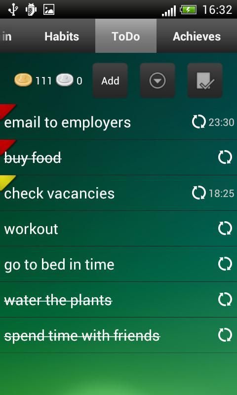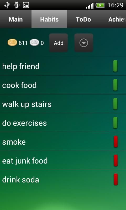 Layar "Kebiasaan". Anda dapat menambahkan di sini kebiasaan yang Anda ingin mengolah dan orang-orang yang Anda ingin keluar dari. Kebiasaan baik yang diberikan oleh uang dan pengalaman. Berikut kebiasaan buruk dihukum dengan hukuman. Contoh kebiasaan baik - "berjalan menaiki tangga", "latihan kecil setelah setiap jam kerja".