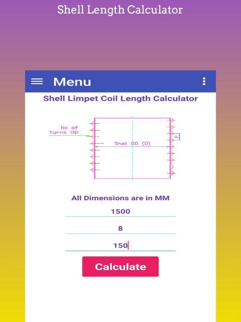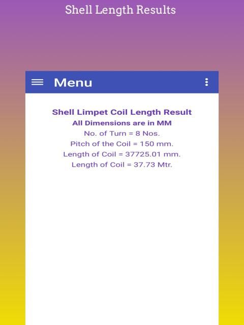 Dalam Aplikasi ini panjang Coil untuk Limpet pada Shell Hitung dengan menggunakan Input sebagai Diameter Shell, Jumlah Putaran, Pitch Coil. Anda Dapat Dengan Mudah memperkirakan panjang untuk Coil untuk Penentuan Biaya dan memperkirakan Tujuan.