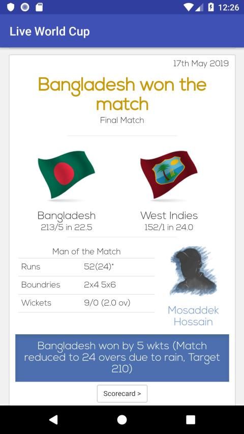 This is just a live score & schedule app. We are getting live cricket world cup and all other live cricket matches scores data from paid api (https://www.cricapi.com/), we don't host or show any video live streaming content in our app.