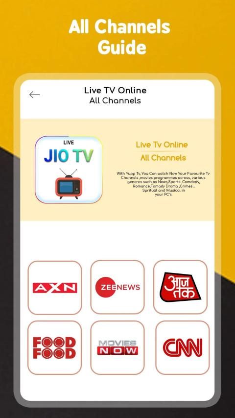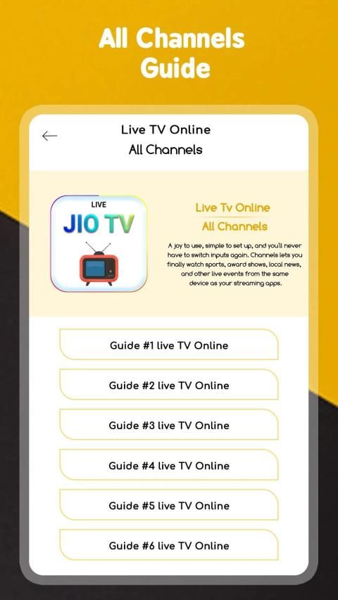 Aplikasi android "Live Jio TV 4K HD Channels Guide" yang memungkinkan untuk membaca Panduan Cara melihat ulasan, cuplikan film sebelum Anda menontonnya.