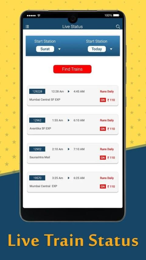 Live Train Status is fully featured all in one App.It is one of the fastest and a very light weight application to find all necessary information about Indian Railways with a very simple interface. You can book train tickets and get Live Train Information like how much delay your train is and position at any time as well as a ton of information like Platform number, Train schedule, seat availability, PNR Status etc.