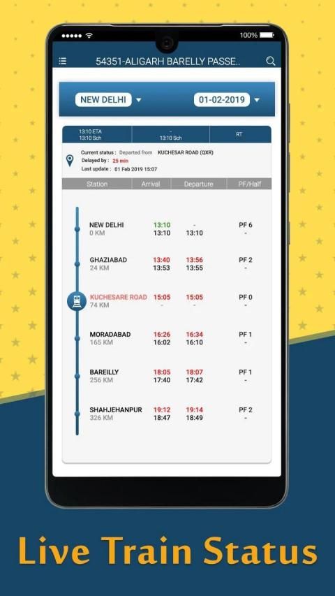 Live Train Status is the Fastest, simplest and a very light application to find every necessary information about Indian Railways with cool native interface. You can get the train status regarding current delays and position at any point of time while in or before journey plus you can get info like availability and schedule.