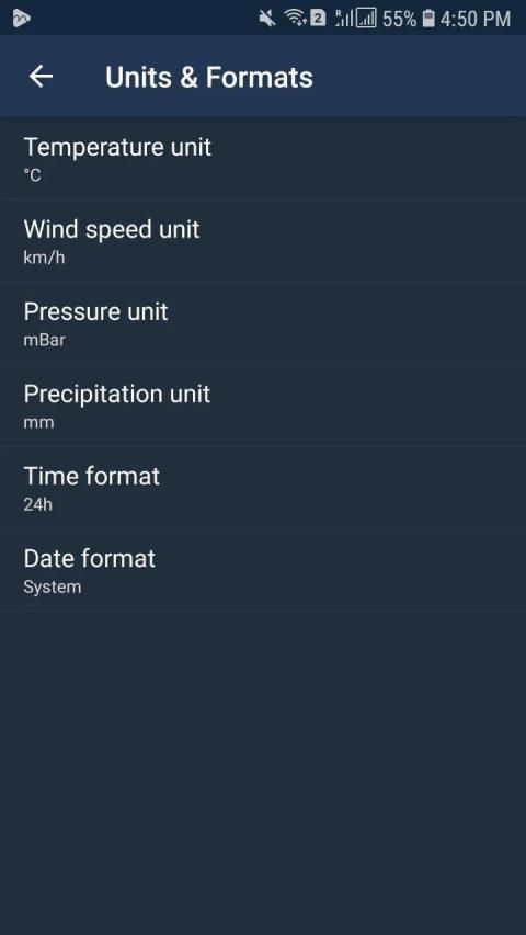 - Mengubah pengaturan unit: Suhu (C / F), Format waktu (12 jam / 24 jam), Curah hujan (mm, inci), kecepatan angin (km / jam, mi / jam, m / s), tekanan (mmhg, hPa, mbar )