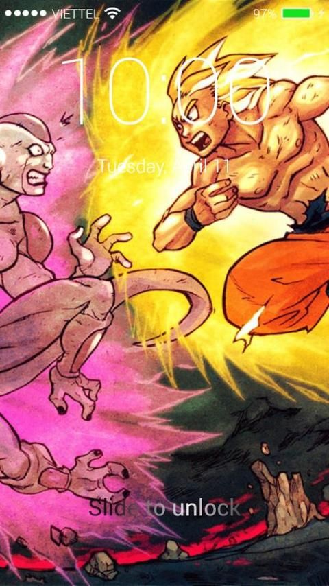 Kunci layar dengan keamanan kode akses, gaya iphone dan gambar latar belakang Dragon Ball Z.