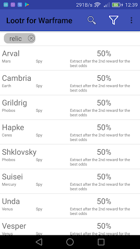 Tambahkan item dan aplikasi akan menghitung peluang drop rata-rata untuk mendapatkan item itu untuk semua misi dalam perang. Itu kemudian akan mengurutkan misi sehingga yang terbaik muncul di bagian atas daftar. Tekan misi apa pun dalam daftar untuk melihat tampilan terperinci dari semua hadiah untuk setiap rotasi dan peluang drop mereka. Anda juga dapat melihat peluang untuk mendapatkan item yang Anda cari untuk setiap rotasi.
