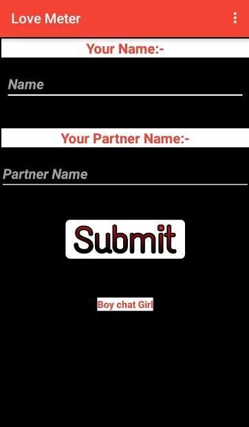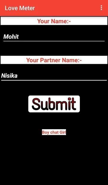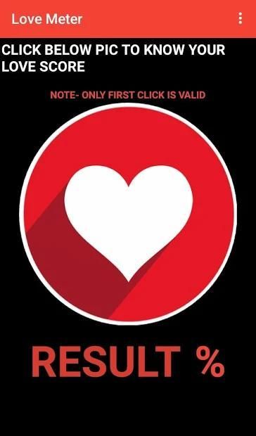 Hi users this is an app named "LOVE METER" by using which you can easily you can calculate your love bond with your opposite partner. This is an interesting and very easy to handle app for checking your Love bond because "Love is not only something u feel, it is something you do. So keep loving...