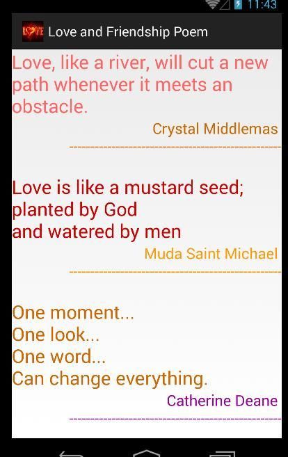 Download aplikasi Android di 9Apps , gratis dan aman! 30,000+ Pengguna mendownload Love and Friendship Poem versi terbaru di 9Apps secara gratis! Kamu akan merasa lebih baik ketika kamu mulai bermain. Aplikasi HOT ini di rilis tanggal 2017-11-25. Anda bisa download gratis dari 9Apps !