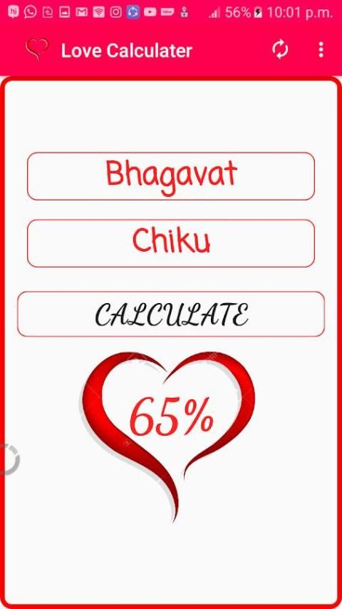 Tes ini kalkulator Cinta didasarkan pada algoritma numerik kuno yang dapat menghitung pertandingan cinta Anda, cinta kompatibilitas Anda persen atau berat cinta sejati antara nama Anda dalam beberapa detik.
