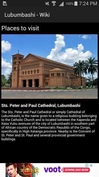 Lubumbashi – Wiki also gives out offline information about the Popular Attractions like Sts. Peter and Paul Cathedral Lubumbashi,Lubumbashi Zoo.