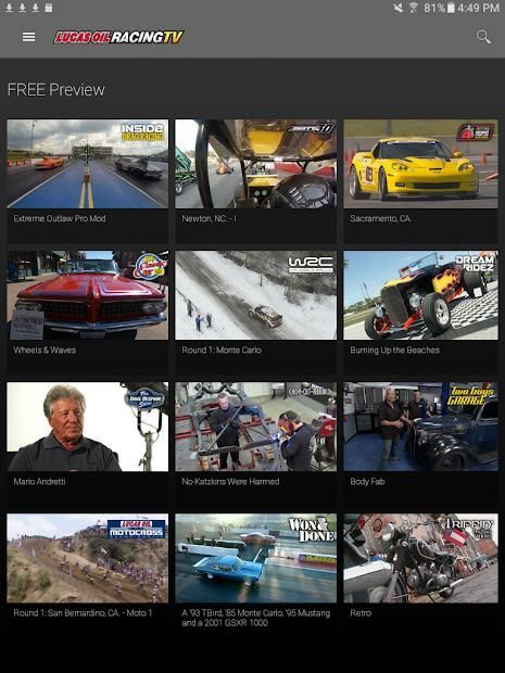 Lucas Oil Racing TV fitur on-demand motor dan pemrograman otomotif 24 / 7. Pilih dari ratusan pertunjukkan di perpustakaan kami konten atau duduk kembali dan biarkan kami melakukan pekerjaan ketika Anda menyetel ke "Cruise Control" dan menemukan acara favorit Anda sudah bermain. Jangan lewatkan LANGSUNG eksklusif feed dari beberapa peristiwa terbesar balap dunia!