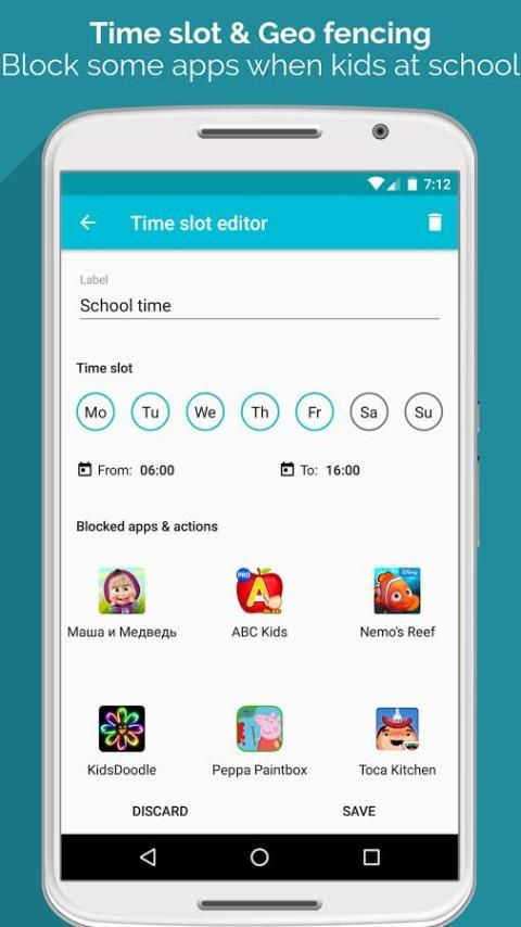 • Waktu slot & geo fencing: blok yang dipilih aplikasi ketika anak Anda di sekolah atau keluarga waktu