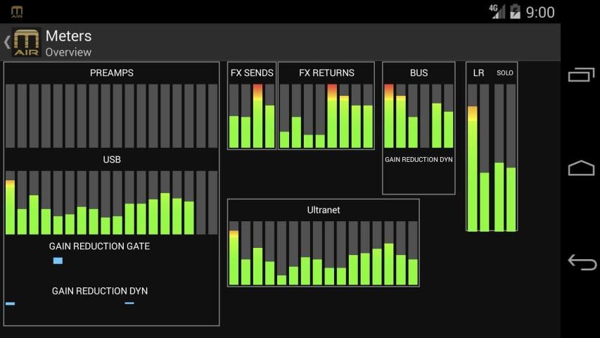 M-AIR untuk Android® memberikan kontrol yang komprehensif untuk MR18 dan MR12 mixer. User interface yang dikonfigurasi untuk baik akses disederhanakan atau editing tingkat ahli (S / E), untuk mencampur 18 saluran input ke 12 bus. Kontrol juga disediakan untuk prosesor efek stereo internal yang 4 - yang semuanya menampilkan kritis-diakui mesin pemrosesan audio Midas M32.