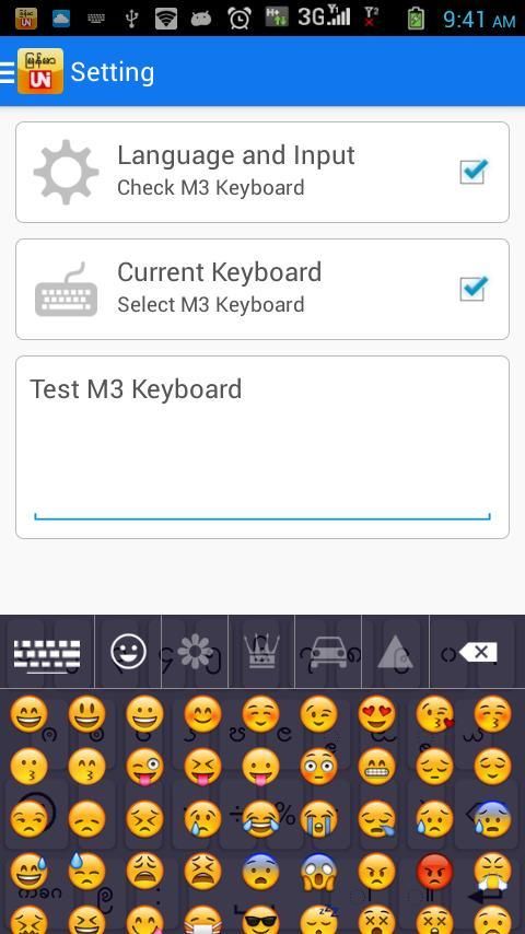 (သို့သော် versi android 4.4 အောက် ဖုန်းများတွင် သွင်း ထားသော ယူနီကုဒ် သည် 100 ရာနှုန်း ပြီး ပြည့် စုံ မှုမရှိ သ ဖြင့် M3 Keyboard ၏ အထူး လုပ်ဆောင်ချက်များကို ကောင်းစွာ အသုံးချ နိုင်မည် မဟုတ်ပါ.)