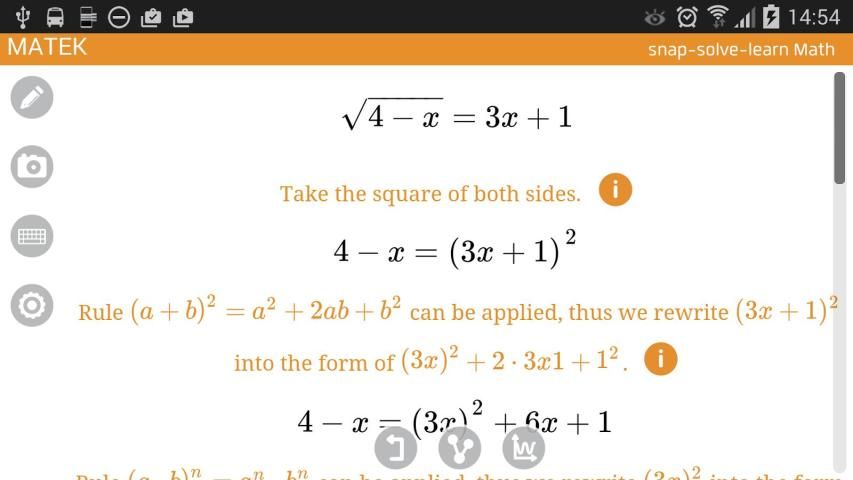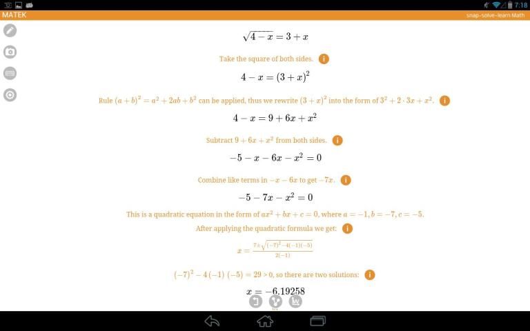 Mengambil gambar dari persamaan atau coretan pada perangkat pintar Anda dan Matek akan memandu Anda melalui pemecahan masalah matematika Anda. Jika Anda membutuhkan lebih banyak bimbingan, Matek akan mengarahkan Anda ke situs web pendidikan di mana Anda dapat mempelajari segala sesuatu dari awal!