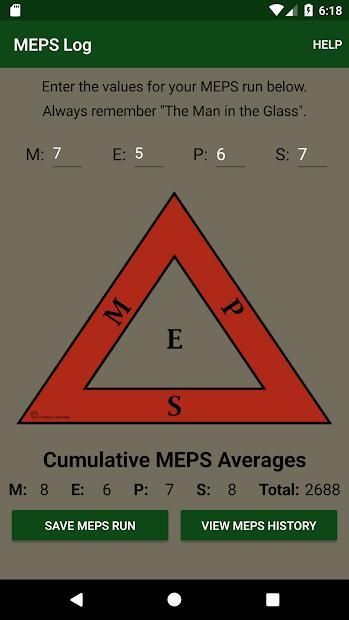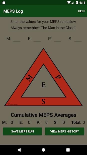 This application automates this process for you, and keeps track of every MEPS run that you record. A lifetime average is kept and displayed on the home page to give you a sense of where you are now, and how you can improve. Strive for self improvement, and strive for balance.
