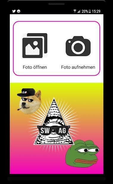 You can choose a Picture from Gallery or you can take a new Picture. To add MLG Sticker just press the illuminati Button in center. Find a complete collection of MLG Memes and Sticker. To place on your Photo just tab on a Sticker and drag to the position you want. Save your Image and share it with your gaming friends and others with the Share and Save Button.