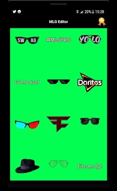 MLG Photo Sticker Editor App mencakup beberapa MLG Gaming Meme Sticker seperti Thug Life Sunglasses dan Gangster Topi, Bling Bling Kalung atau Illuminati Piramida. Tongkat Dogedog, First Person Shooter Rifles atau senjata lain dengan Bertujuan Crosshair Sticker pada setiap Photo Anda suka.