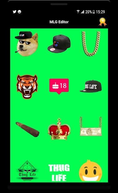 MLG Sticker Photo Editor App includes several MLG Gaming Meme Sticker like Thug Life Sunglasses and Gangster Hats, Bling Bling Necklaces or Illuminati Pyramids. Stick a Dogedog, First Person Shooter Rifles or other Guns with a Aiming Crosshair Sticker on every Photo you like.