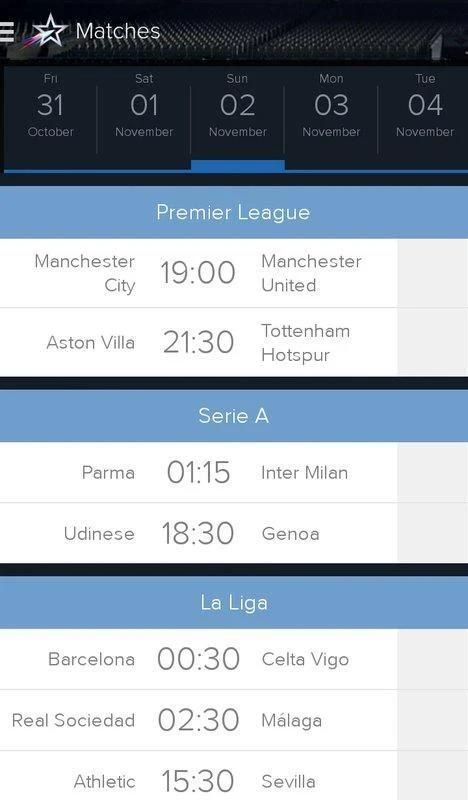 - Peringkat Sepak Bola: daftar perlengkapan untuk semua kejuaraan. Anda dapat mengakses sejarah pertandingan sepak bola sebelumnya dan program pertandingan yang akan datang.