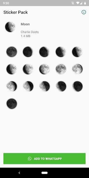 Aplikasi ini memungkinkan Anda untuk menambahkan stiker fase bulan ke WhatsApp untuk dikirim ke teman dan keluarga Anda. Biarkan mereka mengetahui fase bulan saat ini atau seperti apakah bulan akan terlihat pada tanggal tertentu. Setelah stiker dipasang, Anda dapat menyimpan aplikasi atau menghapusnya untuk menghemat ruang.