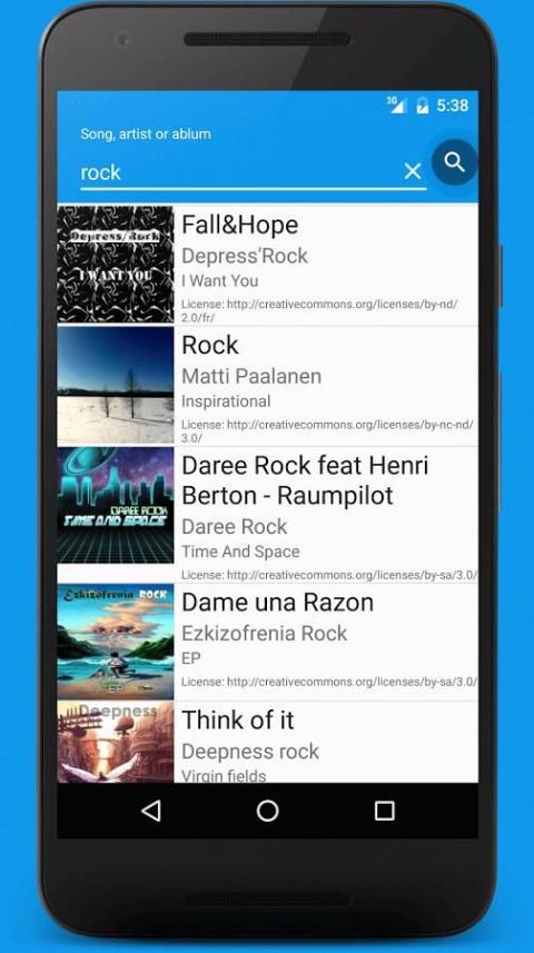 App berwenang untuk menggunakan Jamendo API. Semua musik yang tersedia di bawah lisensi CC (penulis dan link yang disebutkan lisensi dengan benar untuk setiap lagu). Anda dapat menemukan dan menghubungi penulis di www.jamendo.com