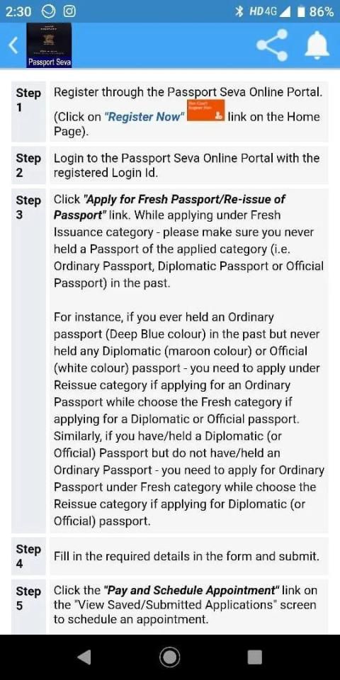 Login ke Portal Online Passport Seva dengan ID Login terdaftar. Klik tautan "Terapkan untuk Paspor Baru / Penerbitan Ulang Paspor". Isi rincian yang diperlukan dalam formulir dan kirim. Klik tautan "Bayar dan Jadwalkan Janji Temu" pada layar "Lihat Aplikasi yang Disimpan / Diserahkan" untuk menjadwalkan janji temu.