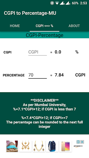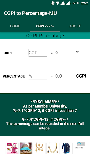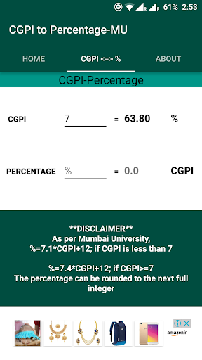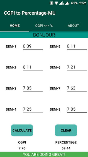 This application calculates CGPI and equivalent Percentage(%) for Mumbai University Engineering students.