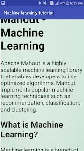 After completing the tutorial a user will be able to know the important concepts of machine learning.This app teaches a beginner a whole concept of Mahout-Machine learning.