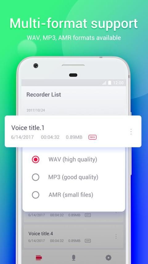 Sihir Recorder - suara, audio, perekam musik menawarkan berbagai jenis format rekaman, seperti WAV, MP3 & AMR. rekaman audio akan dihentikan & disimpan secara otomatis ketika panggilan telepon datang. Jangan khawatir interupsi ketika Anda merekam audio. Jadi pintar perekam audio ini!