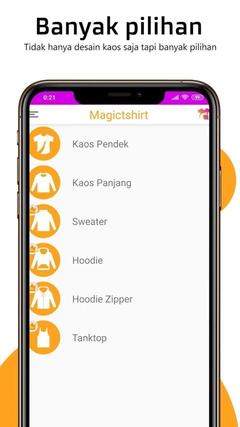 Dalam aplikasi Magic T-Shirt Design, Anda memiliki banyak pilihan desain atau mockup yang bebas untuk Anda pilih. Diantaranya adalah Desain TShirt, Desain Lengan Panjang, Desain Sweater, Desain Hoodie, Desain Hoodie Zipper dan Desain Tanktop.