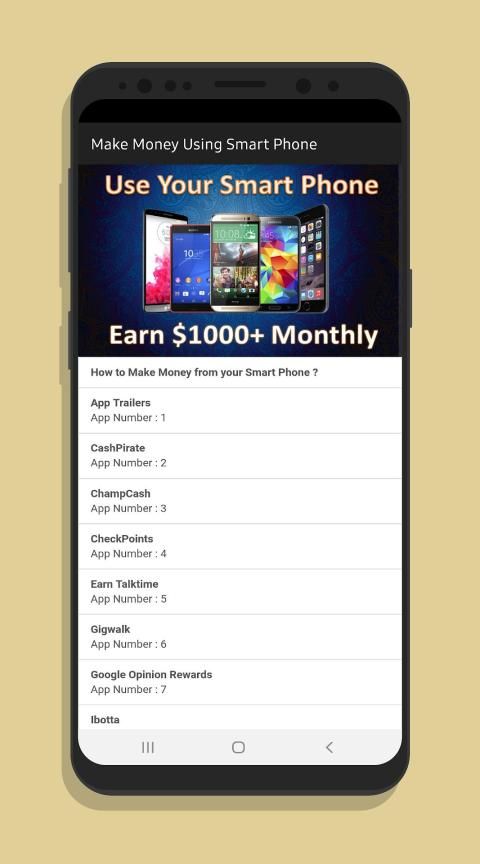 Ada berbagai aplikasi smartphone yang dapat membayar Anda beberapa penghasilan tambahan dengan menyelesaikan beberapa tugas sederhana di Smartphone Anda. Setidaknya ada 20 aplikasi menghasilkan uang yang jika Anda instal di ponsel cerdas Anda, dapat memberikan penghasilan tambahan $ 1000- $ 1200. Anda harus melakukan survei sederhana, menyelesaikan penawaran dengan mendaftar di situs web lain, bermain game, menonton video dll. Anda tidak perlu mengambil waktu ekstra untuk memperoleh penghasilan dari ini karena Anda dapat menghasilkan uang saat bepergian.