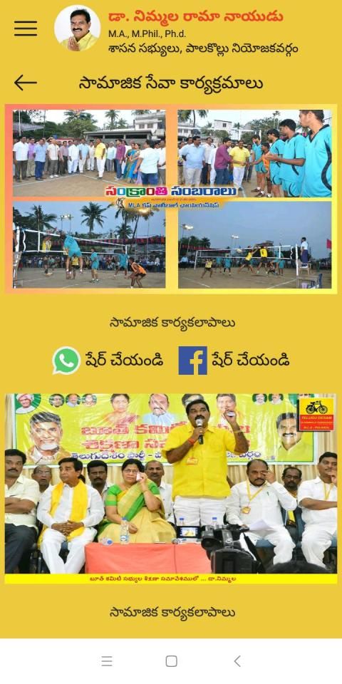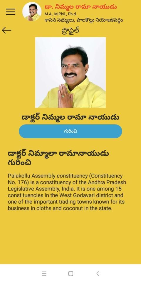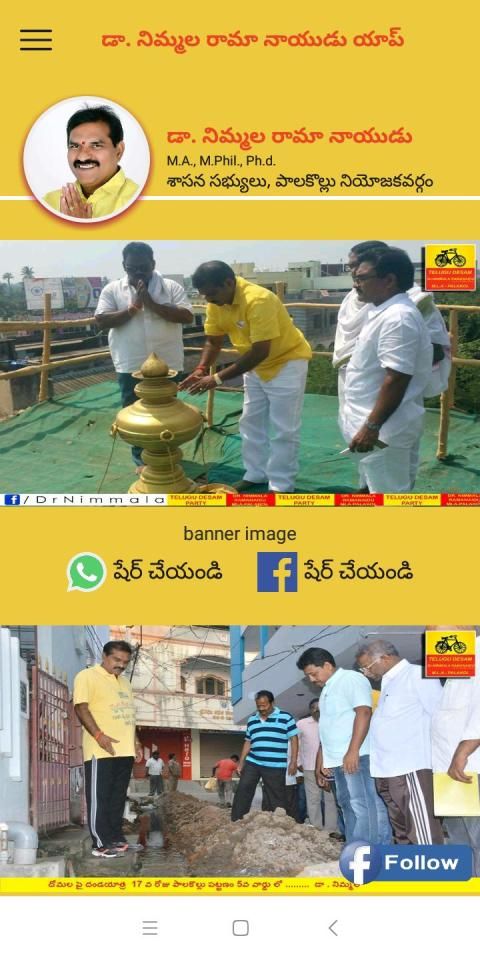 Dr. Nimmala Rama Naidu App is designed for the people of the constituency. This mobile app provides easy access to information of development works, activities and Events of Mana Dr. Nimmala.