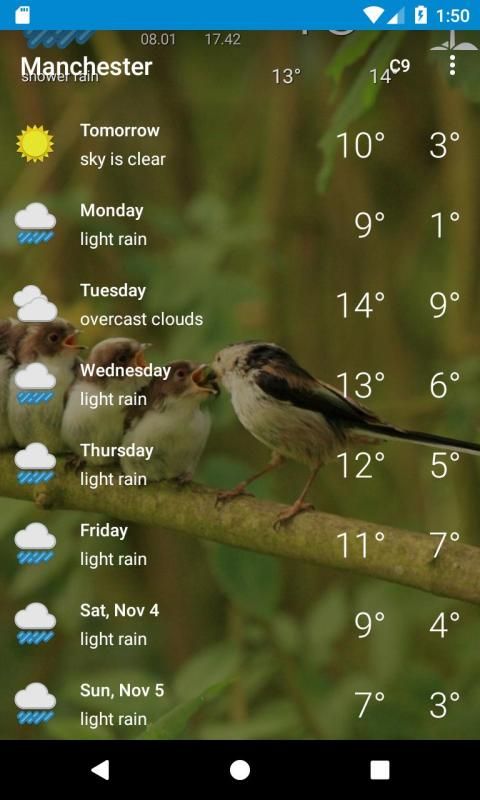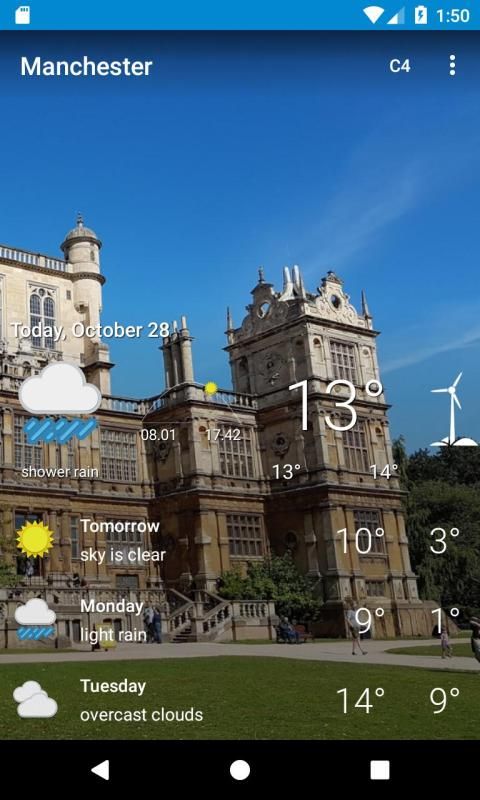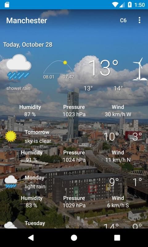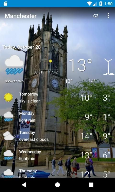 14 day weather forecast for Manchester, Greater Manchester including sunrise and sunset temperature, wind speed, humidity, weather conditions, precipitation and pressure
