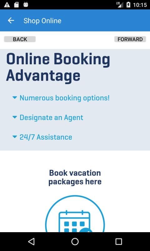 • Shop Online - Looking to book your next vacation? Get easy access to a number of our vacation booking channels right within our app. Our online booking service offers many advantages including our 24/7 assistance, numerous booking options, and the ability to designate an agent - all for no fee!