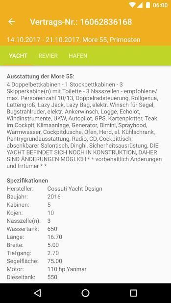 Die App ermöglicht dir, alle Vertragsdetails bequem auf Deinem Smartphone anzusehen. Details zu Yacht, Revier und Hafen oder auch Crewlisten sind so immer griffbereit. Des Weiteren kannst Du aktuelle Törnberichte und Insiderinfos zu Deinem Revier ansehen.