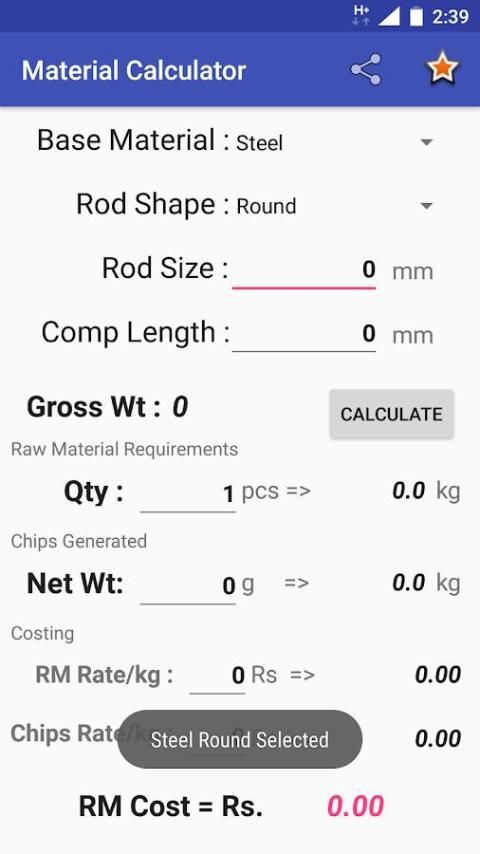 Aplikasi Kalkulator Bahan yang digunakan untuk menghitung berat bahan baku (gross weight) dari komponen dibuat dari bulat, persegi atau segi enam batang basis material baja, stainless steel, kuningan, tembaga atau aluminium.