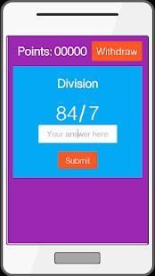 Aplikasi ini memungkinkan Anda untuk memecahkan berbagai jenis masalah matematika dan mendapatkan Paypal uang tunai. Ini termasuk Penambahan, Pengurangan, Divisi, dan Perkalian.