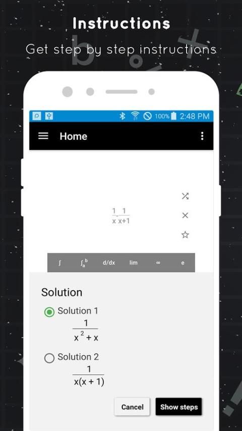 ⭐ Memecahkan sebagian besar soal matematika: aljabar, trigonometri, integral, diferensiasi, batas, bilangan kompleks.
