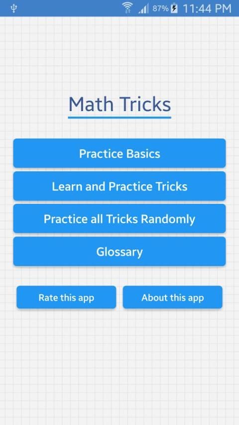 Aplikasi ini hadir dengan trik matematika mudah yang berbeda untuk membantu Anda mengatasi tantangan lebih keras. Trik ini yang terorganisasi dengan baik di bawah "Belajar dan Berlatih Trik" bagian. Jika Anda seorang pemula Anda dianjurkan untuk mengambil beberapa tes praktek dari "Dasar-dasar Praktek" bagian. Setelah Anda yakin cukup Anda dapat mengambil tes lebih lanjut dari bagian ini secara paralel dengan "Belajar dan Trik Praktek".